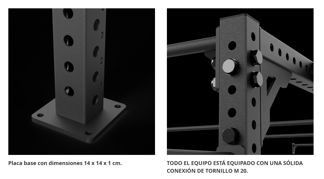 El RIG se puede ampliar de forma flexible con accesorios opcionales (se venden por separado), por ejemplo: ganchos en J, barras de inmersión, estaciones de fijación para sentadillas o soportes para mancuernas.