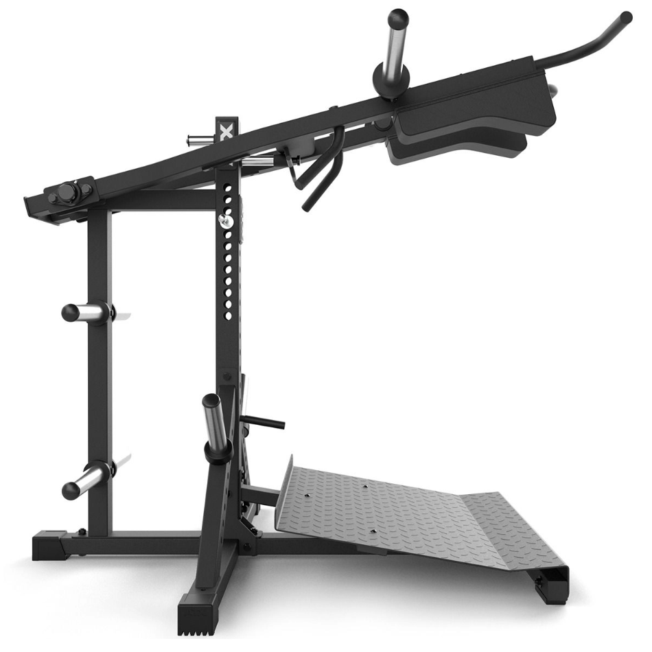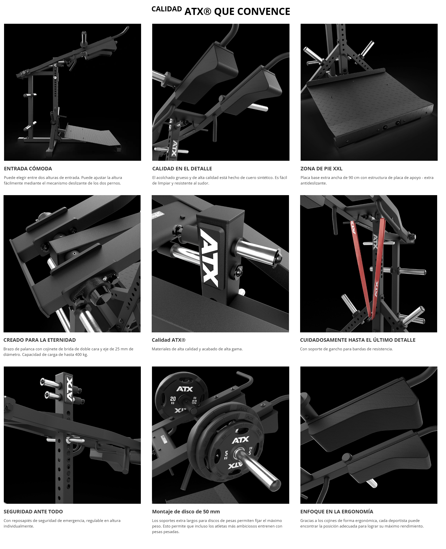 El pesado ATX® Lever Arm Squat PRO no solo permite realizar sentadillas pesadas y anatómicamente correctas, y levantamientos de pantorrillas de pie, sino que también incluye un press Vikingo, que permite el entrenamiento de manera eficiente de esta variante del press de hombros.