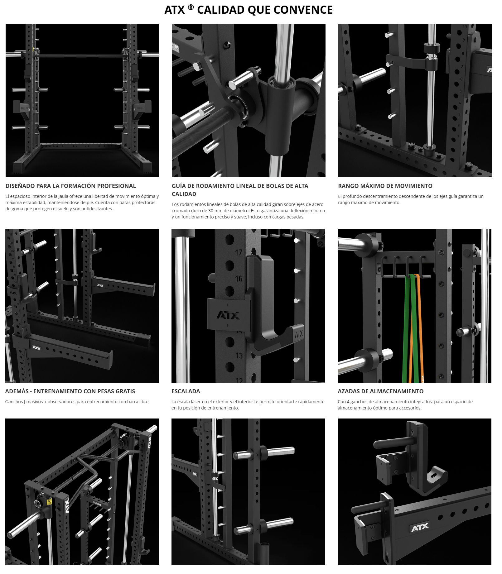La sólida construcción de acero resistente a la torsión, hecha de tubos de acero de 70 x 70 x 3 mm de grosor, es absolutamente estable y está diseñada para soportar las cargas más altas, ideal para el entrenamiento diario intensivo. Los estantes y las posiciones de inicio y fin son ajustables individualmente y su manejo es fácil e intuitivo. Además, su manejo impresiona por su sofisticada ergonomía y su calidad profesional.