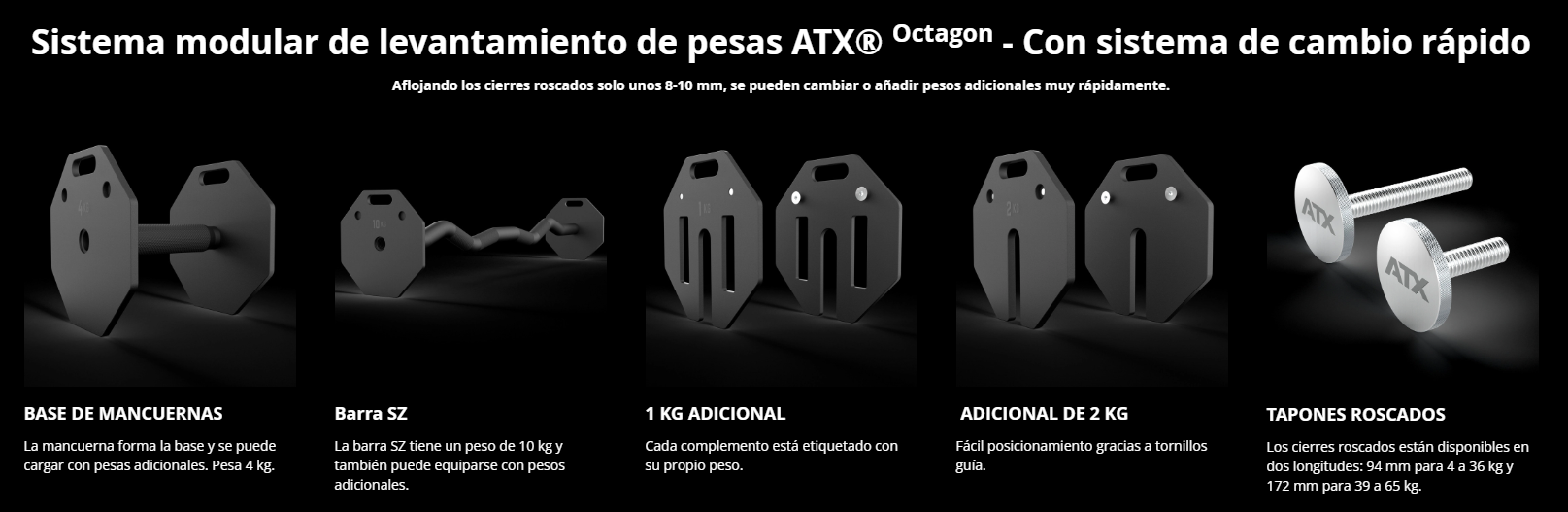 • Ampliable con las placas flexibles ATX® Add -ON disponibles opcionalmente. Pesos adicionales flexibles, que permiten incrementos finos de +0,25 kg, +0,5 kg y +1 kg.