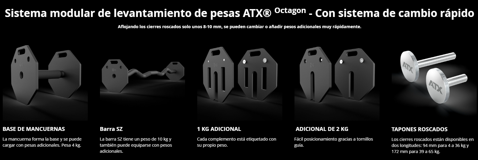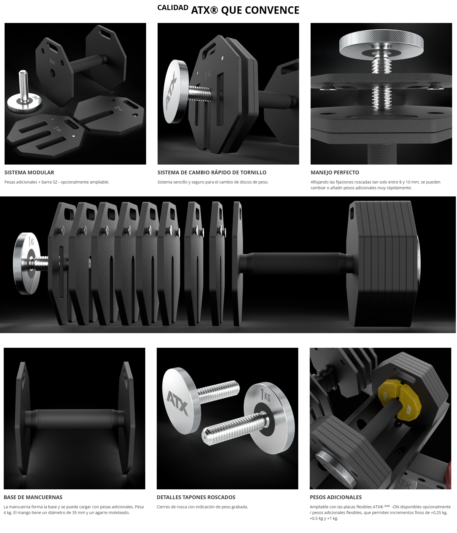 • Ampliable con las placas flexibles ATX® Add -ON disponibles opcionalmente. Pesos adicionales flexibles, que permiten incrementos finos de +0,25 kg, +0,5 kg y +1 kg.