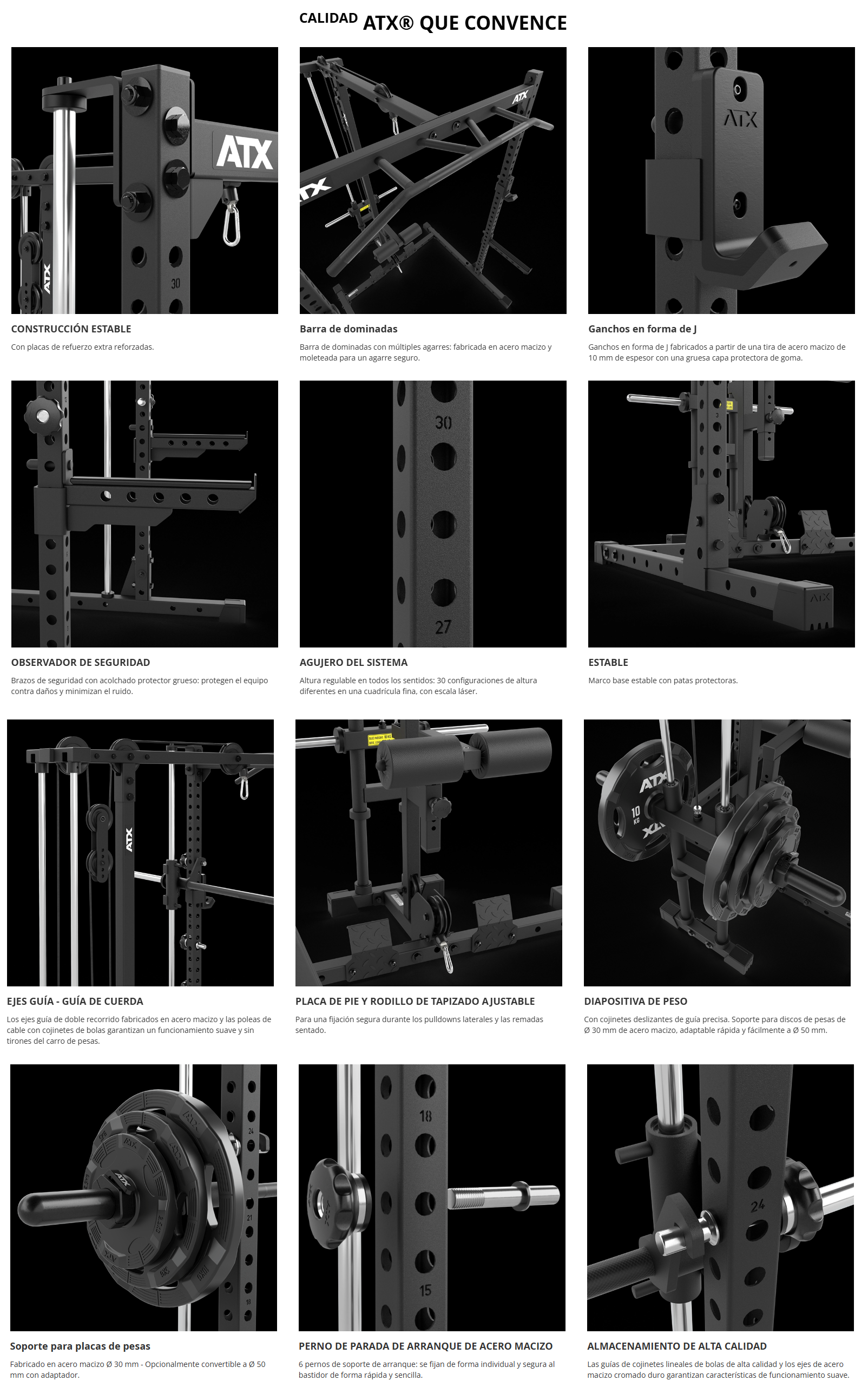 Esta completa estación ofrece una amplia gama de ejercicios en un espacio compacto. Con una altura compacta de tan solo 196 cm, es perfecta para salas de entrenamiento con techos bajos. El rack, la estación de multipower y la estación de poleas son robustos y, a pesar de su diseño compacto, ofrecen una excelente funcionalidad, una característica típica de los equipos ATX®.